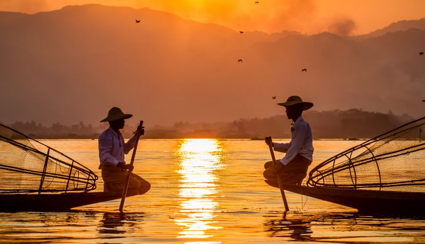 After breakfast you will board your wooden motorized boat and begin heading out onto Inle Lake, one of Myanmar’s most spectacular and breathtaking sights. Its calm waters are dotted with floating vegetation and fishing canoes, to which scenic hills provide the perfect backdrop. Pay a visit to the lake’s morning market (the market is open every day apart from dark moon and full moon calendar days). The market’s location rotates between the lake’s villages in a 5 day schedule and is also visited daily by the lake’s inhabitants as well as the surrounding natives who also come to sell and trade their wares. Along the way you will pass several villages that are built on stilts over the lake, which are inhabited by the local Intha people. Observe the daily activities of the local leg-rowing fishermen and see their ‘floating gardens’, which are built up from strips of water hyacinth, earth and anchored to the bottom of the lake with bamboo poles. You will also visit NgaHpeChaung Monastery, which houses loads of early Shan Buddha Images. In the past this temple was known for its ‘jumping cats’ but these days there are only a few felines roaming around and none are jumping any more. Proceed to the PhaungDawOo Pagoda, the lake’s main haven, which contains five sacred images of Buddha decorated in gold leaf. There are also many traditional crafts origininating on Inle Lake and, should you wish, we can stop for a visit to one making incredible woven items from lotus silk, boat builders (depending on the time of year), a cigar making workshop, blacksmiths or even silver smiths if time allows. The day will come to a close with a return trip by boat back to your hotel.
