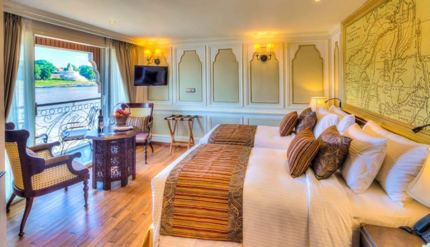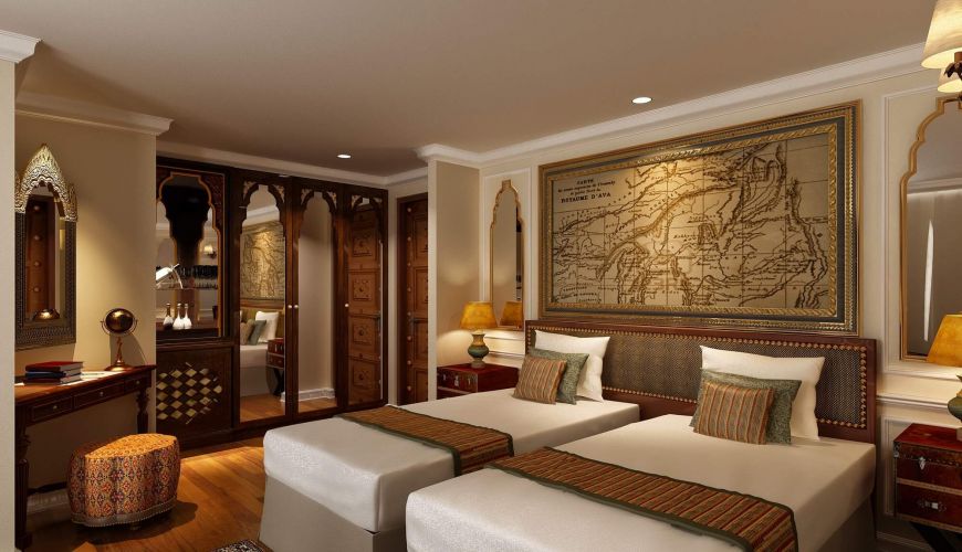 The Imperial Deck of Irrawaddy Explorer provides two Mandalay Suites with generous area of 38 sqm, Double/Twin beds. Mandalay Suites design draws out the most of characteristics of modern contemporary style with the British colonial architecture, giving the best relaxing experience for passengers. Each suite also has paranomic French-style doors leading to a a traditional balcony and a French balcony, both offer fantastic sceneries.