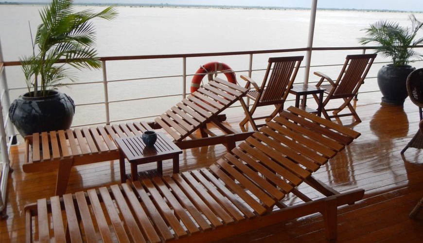 The Upper Deck provides five 17-sqm cabins with Double/Twin beds. The room’ design follows the traditional, yet elegant architectural style with brass and teak finish. All rooms are air-conditioned, equipped with high-class facilities which will give passengers relaxing sensation while resting in the room, including panoramic window with excellent views over the river.