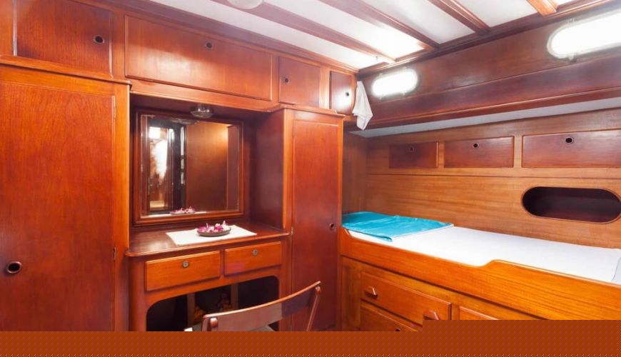 There are three cabins on Scame yacht which can provide accommodation for six guests. The aft cabin is large with a double and single bed as well as a plenty of storage space. One cabin features two single berths while the other has a double bed on the starboard side. All the cabins are fully- equipped with air conditioners and fans.