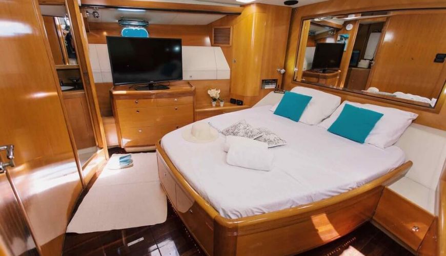 In the front section of the yacht, there is a large owner's suite with modern amenities including a king-sized bed, a large TV and a separate bathroom and toilet.
