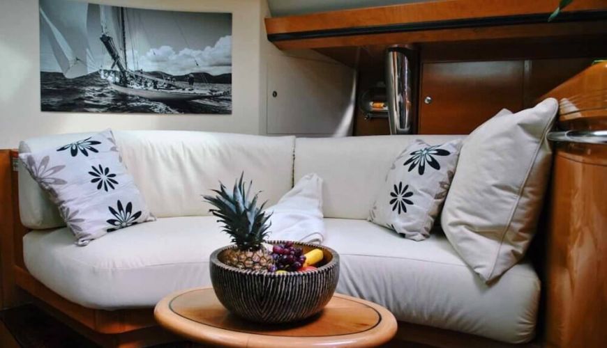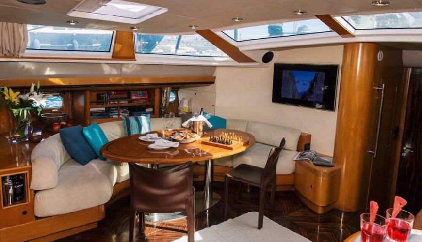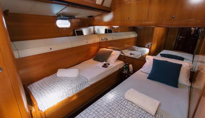 The spacious galley is located on starboard side which is connected to the captain's cabin and the navigation station. There are two spacious cabins for guests equipped with double beds which can be turned into separate twin beds.